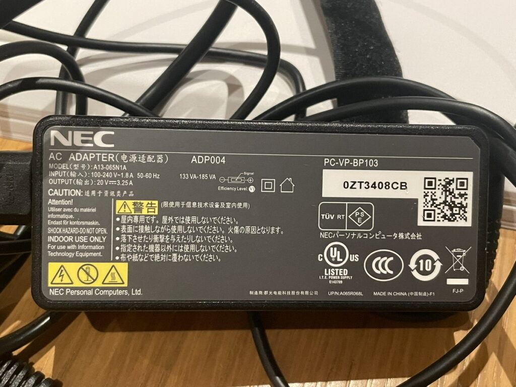 付属のACアダプタはADP004。もしくはPC-VC-BP103。いまだにどっちがメインなのか分かんない。修理屋なのに。ごめんちゃい。出力は20Vの3.25Aで65W。まあ型番よりも大事なのは出力の数値ですから。間に合わせるときは大体余りものから探しますからね。そのための情報提供だし自分メモってことで。