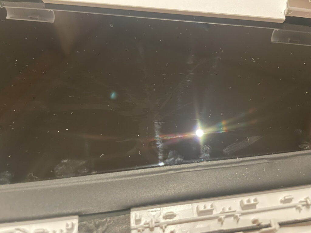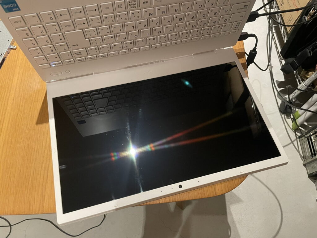 よく光に当てて眺めてみると、うっすらと液晶割れの跡が見えます。液晶割れを日常的に見ていないと、これが液晶割れってことに気付かないのかもしれませんね。うん、たしかに分かりづらい。