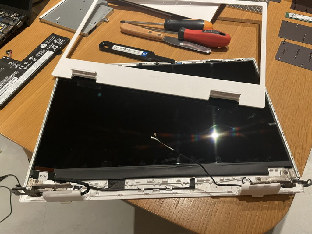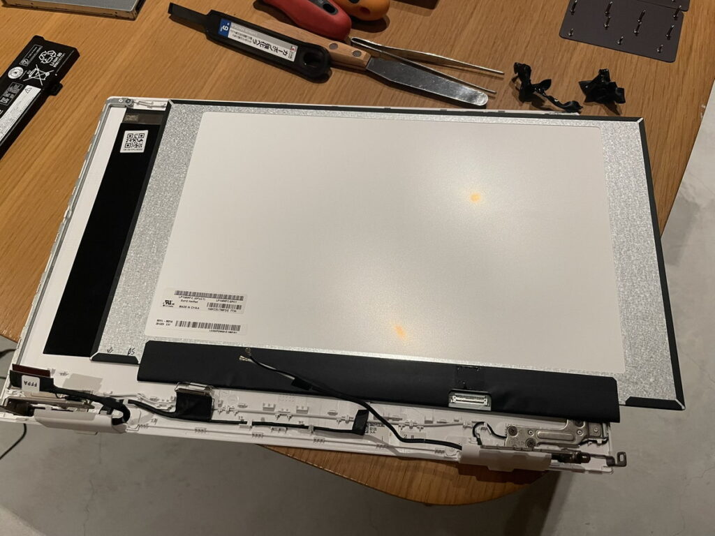 元のパネル型番はLP156WFC(SP)(C1)、あれ?最近のパネルってかっこなしも記載されてるんですね。じゃあこっちが本当なのかも、LP156WFC-SPC1。ご自分で交換チャレンジしてみようって方はヤフオクで型番検索してみてください。