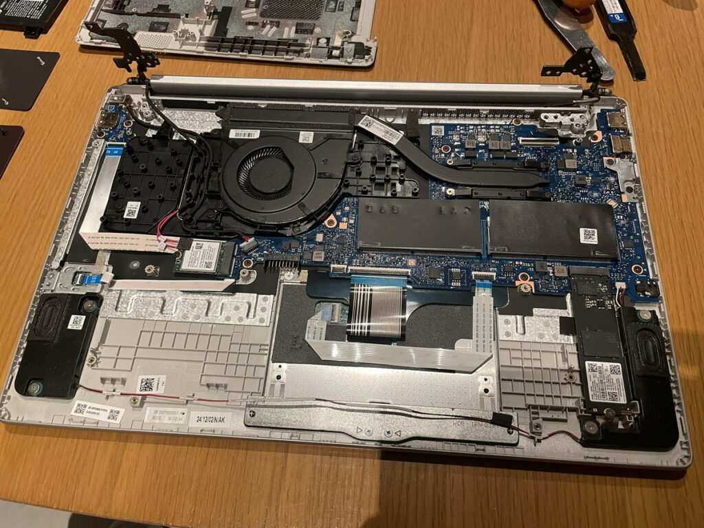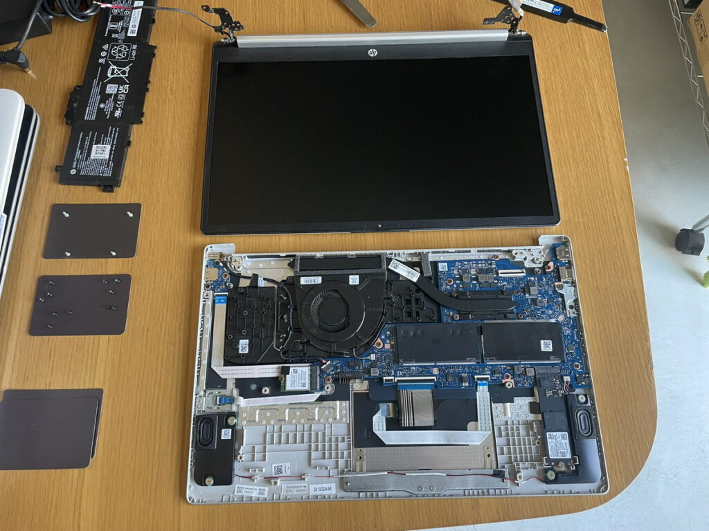 裏面のネジ4本外せば一気にここまで。ツメで引っ掛かっているだけですから、根性で突破しましょう。なんとなくの思いとしては、最近のツメは頑丈になりましたよねぇ。樹脂っぽい?ちょいと前まではガンガン折れていってた気がしましたが。修理屋にやさしくなったものです。とはいえ、液晶パネル交換自体はややハードモードにしちゃってくれてますけどね。昔がイージーすぎたとも言えなくもないですが。