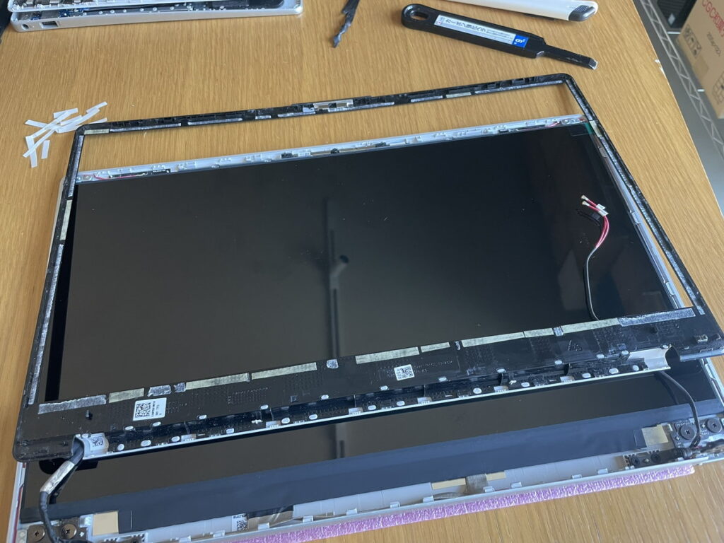 写真はバラした直後ではなくて組み上げてる最中のものなんで、やや辻褄が合わなくなっていますが・・・。ポイントは画面枠は両面テープで留まっているので、恐れずグイグイ突き進むしかないってことですね。キレイに剥がそうとは思わず、また両面テープ貼り直すつもりでやってください。