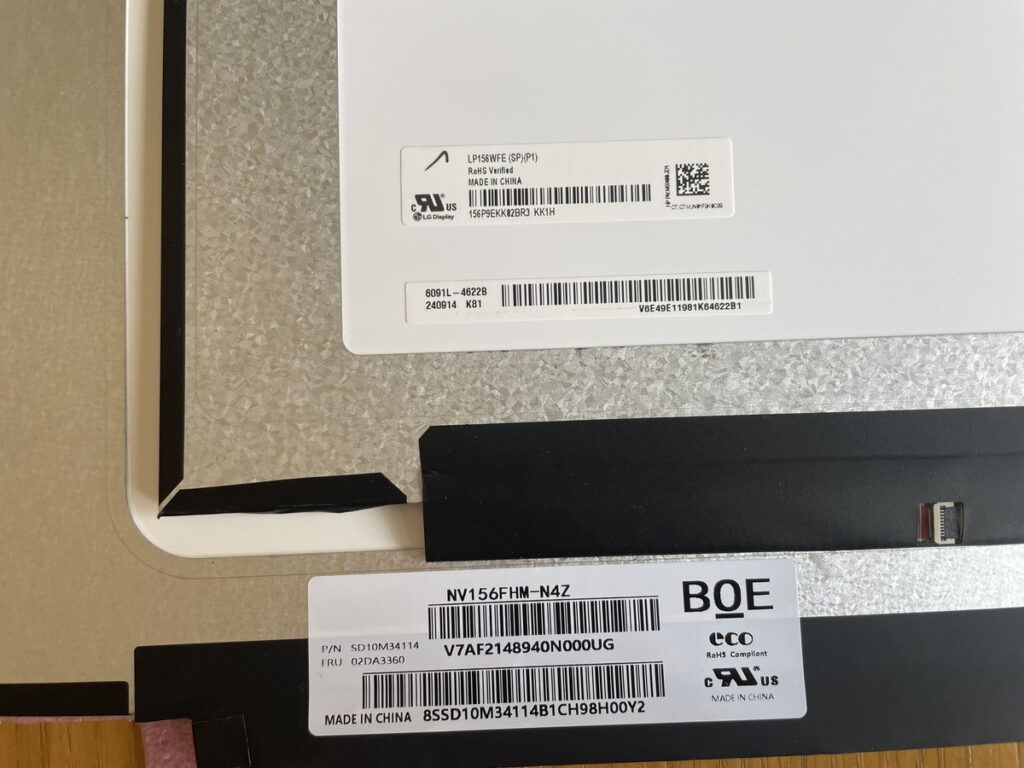 元パネルの型番がLP156WFE(SP)(P1)で、交換後のパネルがNV156FHM-N4Z。15.6インチのフルHDです。30ピンのノングレア。