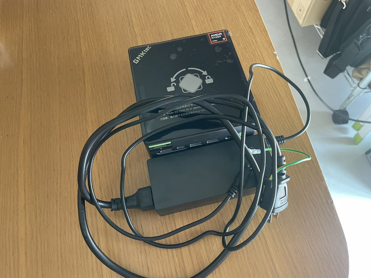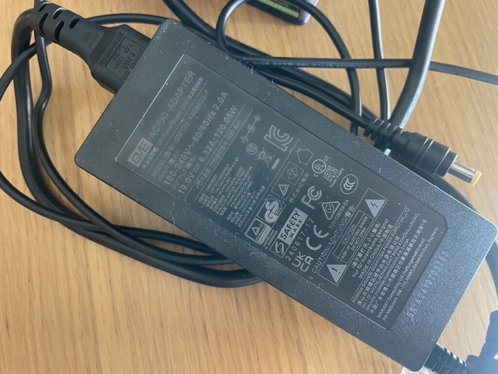 付属のACアダプタ型番はGM122-1900632-F。でもこのパソコンの場合だったら大事なのは19Vの6.32Aのほう。こんなに小さいのに120Wも必要とは。大食らいですね。
