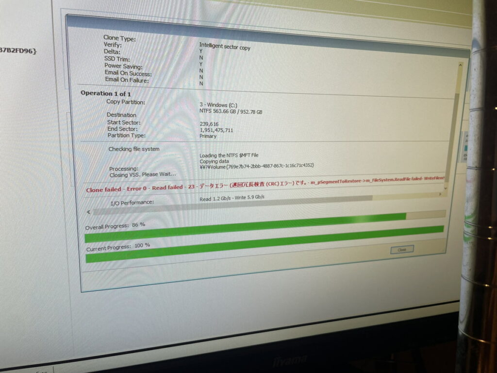 うーん、面倒だけど作業を前に進めるためには手段を選んでられないんで、SSDをUSB接続にしてソフトウェアクローンにしてみます。